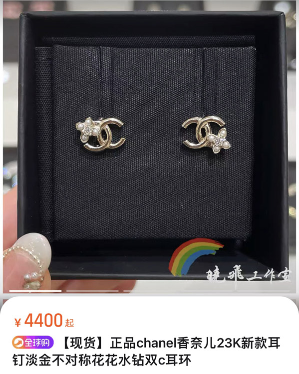 Celine pearl rhinestone small flower gold double C earrings-3898