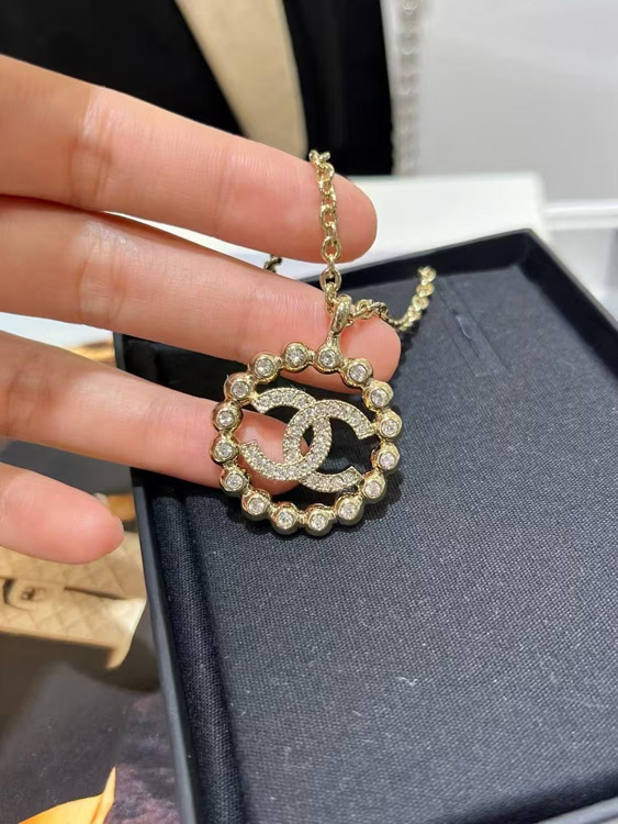 Chanel gold full diamond double C hollow round necklace-3748