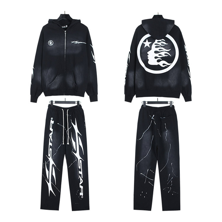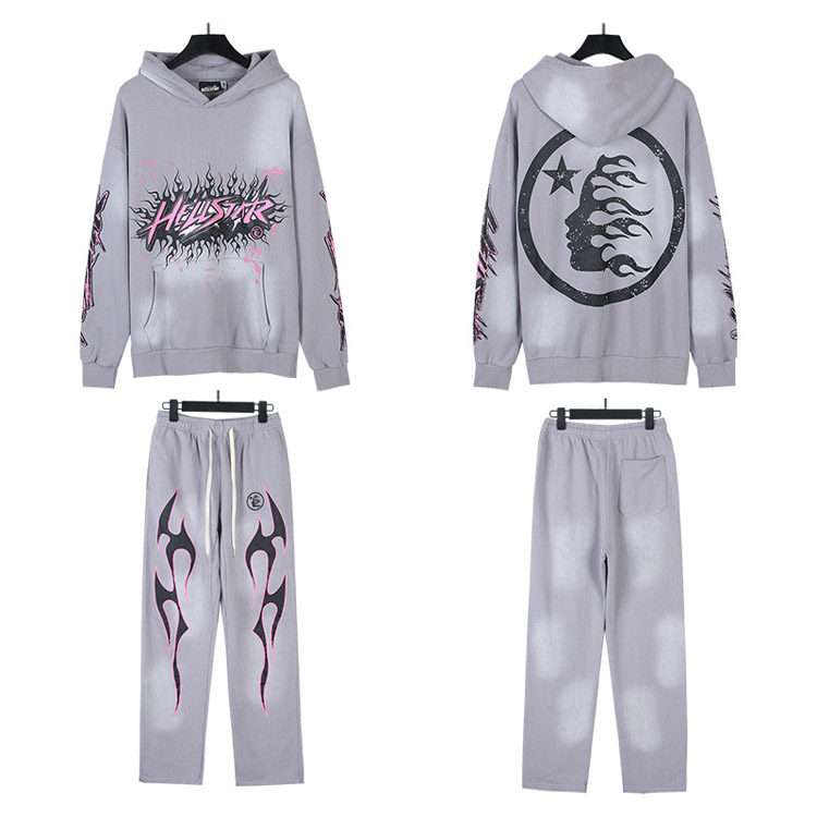 Hellstar Letter Flame Hooded Long-Sleeve Sweatshirt and Sweatpants Set-4550